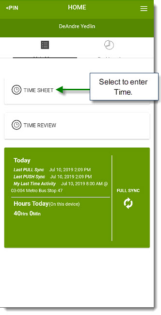2. Select the TIME SHEET option from the HOME screen.
