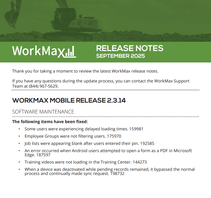 Thank you for taking a moment to review the latest WorkMax release notes. If you have any questions during the update process, you can contact our WorkMax Support Team at (844) 967-5629. February 2025 WORKMAX MOBILE RELEASE 2.3.0 Note: This release ...