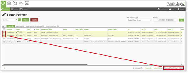 been selected. With these selections, the Selected Total Hours displays the total number of hours they’ve worked
